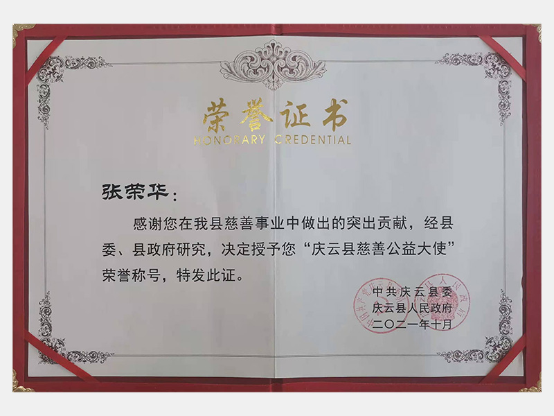感謝您在我縣慈善事業(yè)中做出的突出貢獻,經(jīng)縣委、縣政府研究,決定授予您“慶云縣慈善公益大使”榮譽稱號