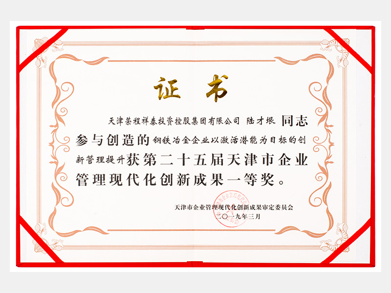 陸才垠同志參與創(chuàng)造的鋼鐵冶金企業(yè)以激活潛能為目標(biāo)的創(chuàng)新管理提升獲第二十五屆天津市企業(yè)管理現(xiàn)代化創(chuàng)新成果一等獎。