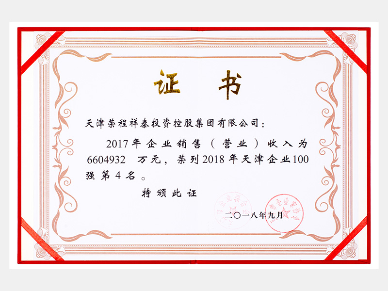 祥泰榮列2018年天津企業(yè)100強(qiáng)第4名